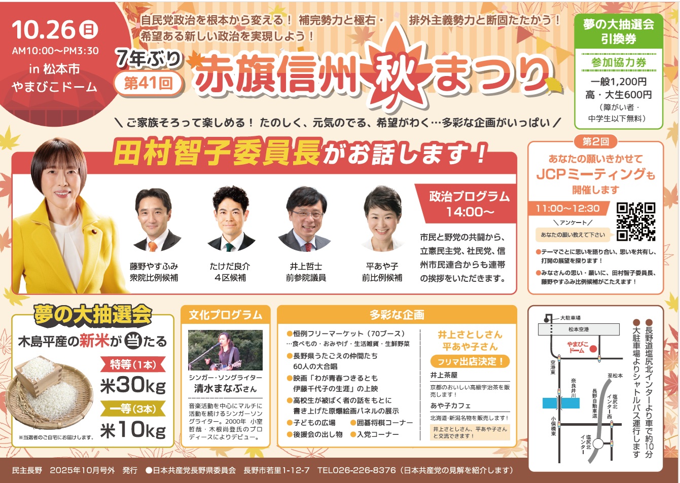 政治プログラムは、今回の秋まつりには、田村智子委員長が駆け付けます!また、藤野やすふみ比例候補、たけだ良介4区候補はもちろん、井上さとし前参院議員、平あや子前比例候補も挨拶します。共闘からは、立憲民主党、社民党、信州市民連合からも挨拶をいただきます。超豪華な出演メンバーとなります。