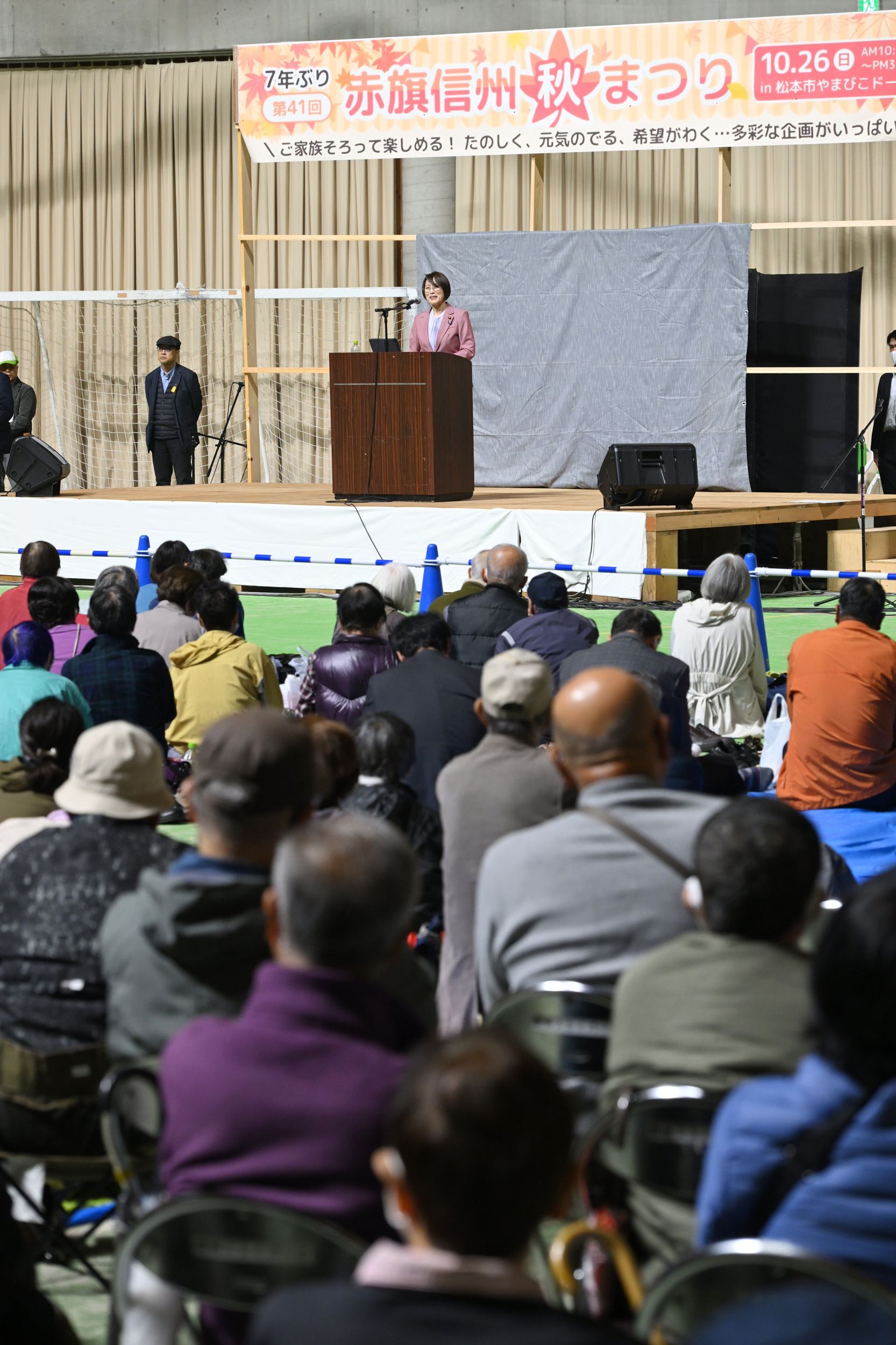 赤旗信州秋まつりには、来賓として、立憲民主党の杉尾秀哉参院議員、社会民主党の中川博司県議、信州市民連合の又坂常人共同代表、宮下健彦・中川村長があいさつしました。杉尾氏は「立憲勢力がともに力を合わせ」高市政権に対抗していく必要性を説き、野党統一候補が参院選で5連勝を果たしている「信州で示した力を全国で広げよう」と訴えました。