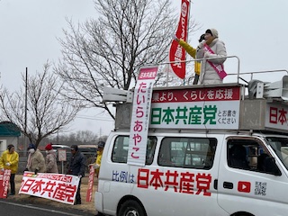 7日は、藤野やすふみ比例候補は、上田市を出発し、坂城町、千曲市で遊説後、長野市内で遊説。平あや子比例候補は、松本市内で遊説し、最終日にふさわしい気迫ある訴えで、「こんな時だから共産党、比例は共産党を広げてください」と訴えました。